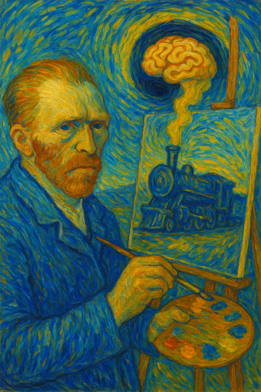 Bildbeschreibung: (KI generiert – ich hatte gerade weder Pinsel noch Farbe 😉 Van Gogh malt das Bild seines epiphänomenalen Bewusstsein – Darf er das überhaupt?